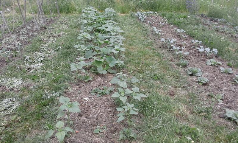 Na velkém záhonu s dýněmi už jsou kromě brambor vidět i nějaké dýně. Zatím to není 100%, jak bychom chtěli, ale je to o dost lepší jako minulý rok a snad se dočkáme i odrůd, které minulý rok úplně selhali.