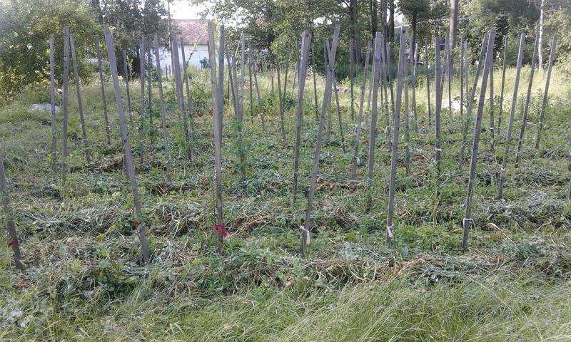 Podobná situace jako u malin je i u ostružin. Ze dvou vysazených odrůd jedna ani první rok na jaře neobrazila, ale ta druhá („Čačanská beztrnná“) se celkem snaží růst. Je to vzpřímená odrůda, takže jsme ji vysadili k malinám. Můžeme použít stejný způsob pěstování s vyvazováním výhonů do „V“. Ostružiny asi hlodavce zvládají líp než maliny, ale i tak jim průběžně uschlo hodně prutů. Když se jedná o prut plný plodů těsně před uzráním, tak to fakt nepotěší. Vysekal jsem i prostor kolem ostružin a vyřezal suché pruty. Na obrázku je ale ještě ostružina se suchými pruty. Plánuji ji taky trochu namnožit a rozšířit plochu pro pěstování na zahradě i chalupě. Je super, že tato odrůda nezabere moc místa, je beztrnná, a navíc nám plody moc chutnají.