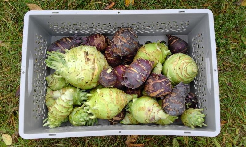 Na zahradě máme ještě stále relativně co sklízet. Tento týden přišla řada na kedlubny. Zůstali nám hlavně velké bílé kedlubny odrůdy „Superschmeltz“ pro uskladnění. Nechával jsem je na zahradě co nejdéle, aby pořádně vyrostly a dozrály. Teď už vypadají, že je nejvyšší čas pro sklizeň. Kedlubnám už začali odumírat listy a celkově se nějak začaly naklánět k zemi. Spolu s bílými kedlubnami jsme sklidili i zbytek modrých, které ještě zůstaly v záhonu s pórkem. Dohromady toho je jedna přepravka. Ne všechny kedlubny jsou stejně velké, ale ta největší stojí za to. Vážil jsem ji a má něco málo přes 2,5 kg. Všechny kedlubny poputují na chalupu k uskladnění. Kedlubny jsme ještě nikdy neměli uskladněné přes zimu, tak jsem zvědavý, jak dlouho vydrží. V nejhorším případě, kdyby hrozilo že nevydrží, tak je stále můžeme naložit na kyselo jako zelí.
