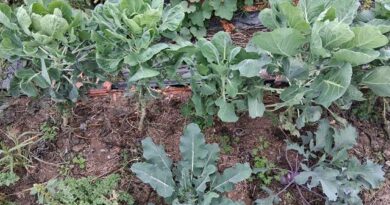 Na plochu pro rajčata jsem připravil devět záhonů, ale rajčata jsem nakonec vysadil jenom na osm z nich. Na ten poslední devátý už ani nevyšlo zelené hnojení a měl výrazně nejhorší půdu ze všech devíti. Byl nejblíže k bývalým zbytkům baráků, které jsme nechali odstranit. Čím blíže jsme k místu bývalých baráků byli, tím více jílovitá a kamenitá byla půda. U posledních záhonů jsem při rytí musel hodně používat krumpáč, protože jinak jsem kameny vyndat nemohl. I když nebyl poslední záhon nějak super, co se týká půdy, nechtěl jsem ho nechat jenom tak prázdný. Zelené hnojení jsme už neměli, tak jsme tak vyseli mix různých druhů zeleniny. Spíše na zkoušku než s plánem velké produkce. Jednalo se o cibuli, řepu, hrášek, pórek, saláty a mangold. Na každý konec záhonu po řádku kytek navíc. Pro nejhorší úsek záhonu se skoro jenom jílem, jsem zvolil hrášek. Jednalo se už jenom o zbytky ze zahrady a spíše jsem ho plánoval jako zelené hnojení. Protože byla půda hodně jílovitá, tak jsem udělal řádky a po výsevu jsem hrášek zasypal půdou nasbíranou z krtinců po pozemku. Možná i díky tomu hrášek dobře vyklíčil i rostl. Vyséval jsem ho jako zelené hnojení, ale nakonec jsme ho normálně sklidili. U zbytku zeleniny na záhonu byl úspěch střídavý. Klíčení bylo dobré snad u všeho, ale růst nic moc. Výživy v půdě asi moc nebylo. Kromě hrášku hodně dobře dopadl salát a část cibule ze sazečky. Nejhůř dopadli na výživu náročné druhy zeleniny, jako mangold a pórek. Sklidili jsme ale i nějakou řepu. Ve druhé vlně jsme vyseli podzimní ředkve a situace byla podobná, jako u řepy (nic moc). I tak ale nemůžu říct, že by byl záhon zklamáním. Vzhledem k prvnímu roku pěstování, a ne příliš úrodné půdě jsme z něco sklidili celkem dost zeleniny.