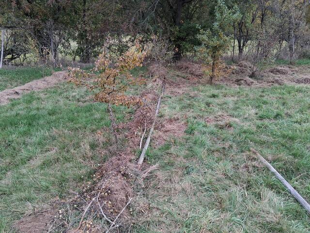 Při likvidaci kopečků jsem si všiml jedné zajímavosti. V každém kopečku jsem našel schovaný jeden žalud. Aspoň jsem si nevšiml, že by jich tam bylo více. Tohle asi bude důvod, proč máme po pozemku tolik nových mladých dubů. Nevím, kdo je tím zahradníkem, co provádí tuhle novou výsadbu, ale celkem se snaží. Doteď jsem si myslel, že nálety jsou po pozemku rozhozené úplně náhodně. Ono to možná ale tak úplně nebude. Možná si příroda trochu řídí, jak bude vypadat nový les. Pro nás to není až tak důležité. Zachovám to, co se nám hodí a zbytek likviduji. V nejhorším je to organický materiál navíc.
