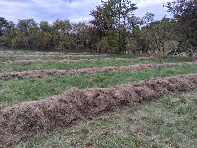 Na poslední letošní nově vytvořenou řadu jsem navozil celkem dost drnů ze zrušených kopečků a taky poměrně hodně náletů. V tom posledním úseku je jich dost a při jejich likvidaci jsem část naskládal na hromadu, že je použiji do další řady. Protože ale další řadu už letos dělat asi nebudu, posekal jsem je a naházel na tu posledně vytvořenou řadu. Dřevnatého materiálu tam tak skončilo hodně. Naopak toho bylinného materiálu bylo méně než u jiných řad, protože jsem toho kvůli obtížnosti kosení nakosil méně. Ale stačilo to aspoň na základní zakrytí dřevnatého materiálu.