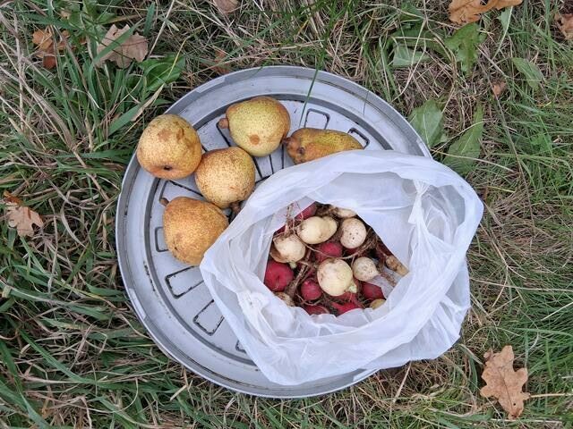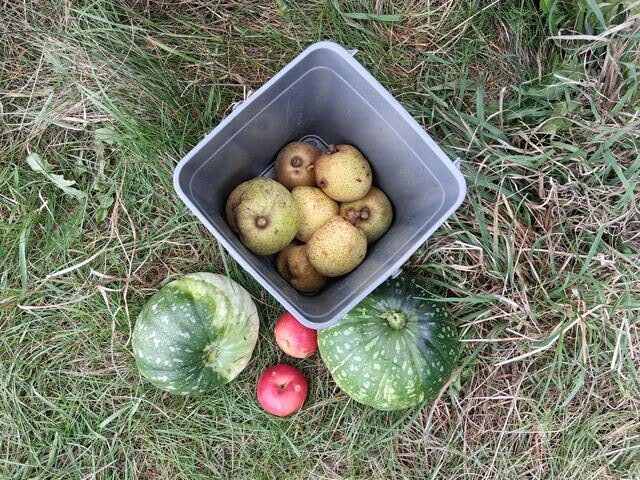 Manželka ještě posbírala pod stromem pár hrušek a vzali jsme i dva dýně, které jsme nesklidili minulý týden při řádné sklizni. Nebyli ještě dost zralé, tak jsme je nechali na zahradě. Protože teď dýně pomrzly, tak už určitě více nedorostou. Samotné plody vypadali celkem dobře, tak jsme je vzali domů, že je zkusíme nějak využít. Než jsme se k tomu dostali, tak dýně začali plesnivět. Jedna hned první týden a další týden druhá. Takže jsme je obě vyhodili.