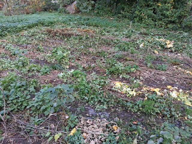 Třetí týden jsem si řekl, že by bylo dobrý trochu poklidit záhony na chalupě. Už tam nic nemáme, jak všechno zmrzlo a je potřeba je připravit na výsadbu česneku. Na konstrukcích byli pořád zbytky ačokče, okurek a hlavně fazolí. Takže jsme jeli v sobotu rovnou na chalupu a pustil se do úklidu. Lépe by se sundávalo, kdyby to bylo více suché, ale na to jsme neměli čas. Zbytky rostlin jsme naházeli na záhony a rozebrali jsme i kovové opěrné konstrukce. Hlavně na šarlatovou fazoli se ukázali jako nedostatečné. Taky by nám překáželi při výsadbě česneku. Sloupky využijeme na zahradě při opravě plotu a pletivo zatím nevím. Později chceme udělat na chalupě lepší opory, když budeme vyrábět nové, trvalé záhony. Později bych ještě rád posekal pozemek na chalupě a na ty záhony, kde nevysadíme česnek, bych rád přihodil nějakou organiku, ať se tam rozkládá.