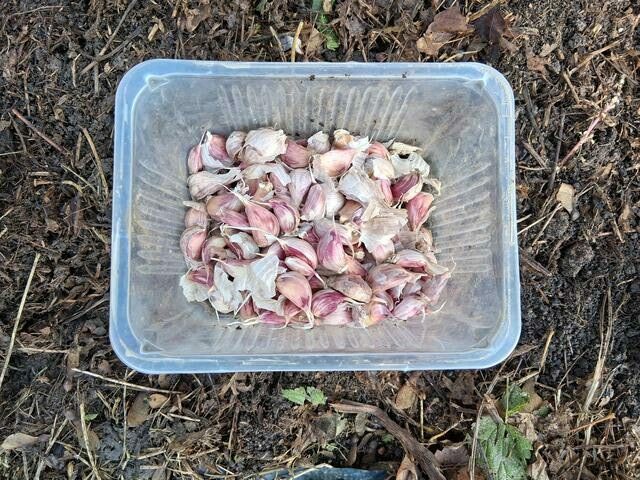 Výsadbu jsem dělal do záhonů, kde byla letos fazole. Záhony vypadají celkem brutálně, když to porovnávám s „klasickými“ rytými, vyčištěnými záhony. Kdybych chtěl dělat řádky, tak bych je musel vyčistit, co jsem nechtěl. Tak jsem jenom hráběmi stáhnul mulč na chodník mezi záhony a rukou natlačil do půdy stroužky ve třech řadách na záhon. Šlo to o dost lépe než minulý rok. Po výsadbě jsem zase hráběmi stáhnul mulč zpátky na záhony. Možná ho bude potřeba na jaře zase odstranit, ale to uvidíme až na jaře.