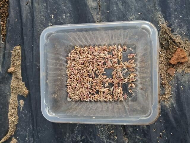 Tento rok jsem chtěl udělat u česneku experiment, a tak jsem nechal několik rostlin česneku vykvést a na podzim si vzal semínka (nebo pacibulky). V pokusném záhoně jsem udělal dva řádky a semínka tam rozhodil. Teď jenom čekat, co z toho bude.