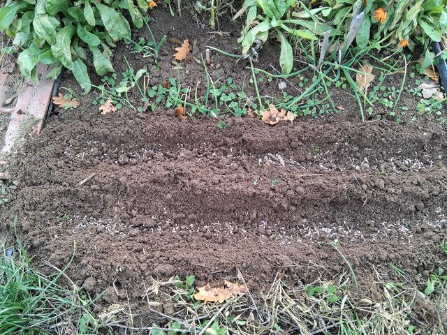 Já jsem sklidil mrkev a manželka dočistila záhon. Pak jsme se vyměnili. Ona šla čistit a třídit mrkev a já jsem se pustil do výsadby česneku. V tom mém záhoně po mrkvi jsem jenom udělal řádky, nic jsem nečistil. Takže tam částečně zůstal plevel a nějaké kytky. Taková menší polykultura. Manželčin záhon byl komplet vyčištěný. Takže máme menší test a uvidíme, jak se povede česneku ve dvou záhonech, který je každý připravený trochu jinak.