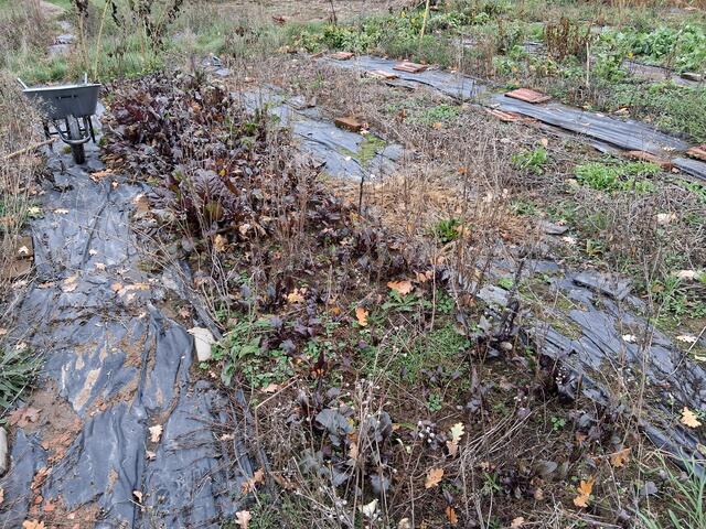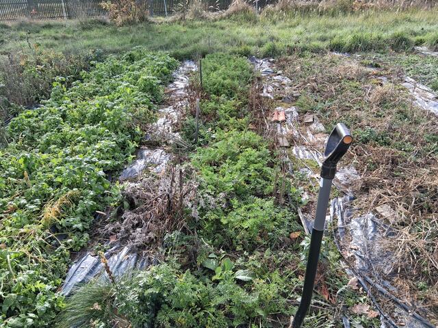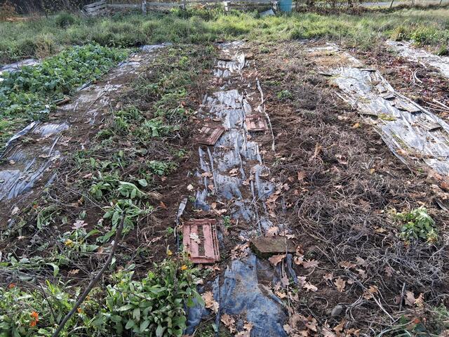 Po kosení a navození organiky na syntropic řadu jsem ještě chvíli pobyl na zahradě, protože jsem už dlouho chtěl postahovat silážní plachty z některých chodníků. Nejraději bych to udělal všude, ale asi by to zatím nebyl úplně nejlepší nápad. Takže jsem je sundal jenom v jedné řadě záhonů, kde budeme prodlužovat syntropic řady. Tuto sezonu jsme tam pěstovali jenom fazole, bob a mangold. Dobře dopadla jenom fazole. Jinak jsem zbytek záhonů nechal zarůstat a ať na zlepšení půdy pracuje příroda. Jenom jsem to přes rok asi dvakrát pokosil. Příští sezonu bych tam rád dodělal řady. No uvidíme, jak to dopadne. V každém případě to už ale nechci zakrývat plachtou a postupně chci plachty stahovat i ze zbytku zahrady.