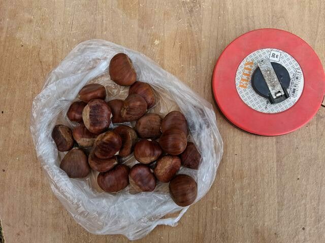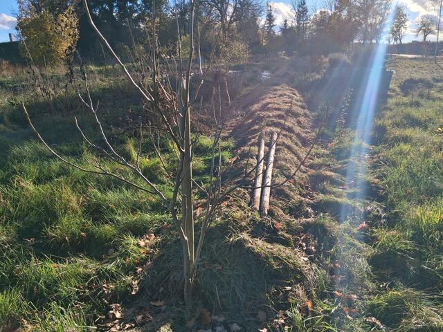 Ještě před koupi zahrady jsem plánoval, co za stromy bych chtěl. Dost dlouho jsem zvažoval ořešáky a kaštany. Nakonec z toho byl jenom jeden ořešák, který ani moc dobře neroste. Teď, s pro nás novým způsobem pěstování jsem se k původním myšlenkám zase vrátil a rozhodl se zkusit vysadit nějaké kaštany. Nechci ale kupovat stromky. Jednak na to ještě nejsou syntropic řady připravené a taky nestojí úplně málo. Namísto toho koupila manželka v Lidlu jedlé kaštany a zkusíme ty. Vysel jsem je na několika místech po čtyři kusy do jedné jamky. Protože tam zatím není moc připravena půda, tak jsem nabral do kbelíku kompost a do každého výsevného místa hodil pár lopatek. Povrch jsem ještě trochu zamulčoval a teď už jenom čekat do jara, jestli se něco povede. S moc velkým úspěchem ani nepočítám, ale něco by z toho mohlo být.