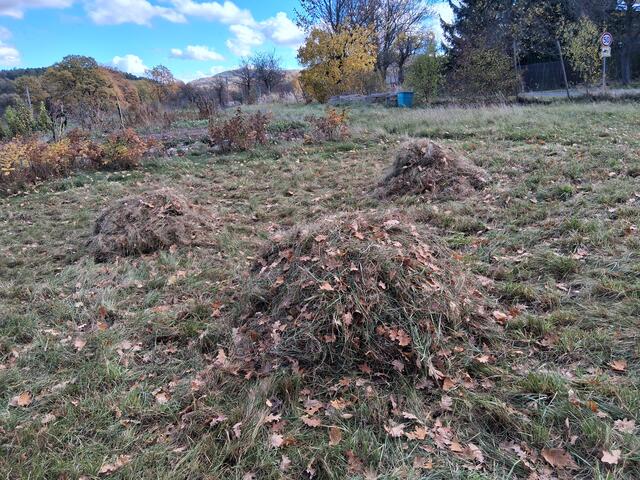 Přijde mi, že s příchodem listopadu skončil podzim a začíná zima. Plánů jsem měl ještě dost, ale obávám se, že je nestihneme realizovat. Hlavně co se týká kosení. Ne jenom kvůli dost častým srážkám, ale i ta tráva už jako kdyby se chystala na zimu. Přesto jsem to zkusil a chtěl ještě něco posekat. Dokonce jsem si i naklepal kosu. Moc to ale nepomohlo. Nevím, jestli jsem ji naklepal špatně, nebo je už tak slehlá tráva, že to kosit moc nejde, nebo neumím pořádně kosit. V každém případě to moc nešlo. Bylo potřeba sekat spíše silou, co dost vyčerpává. Dost jsem si zanadával a zase jsem hodně intenzivně přemýšlel o použití nějaké sekačky. Nějak se mi povedlo dokosit takovou tu přední část pozemku, kterou kosíme nejčastěji. Nakonec bylo i něco málo organiky, aby mi to stačilo na domulčování první syntropic řady. Před výsadbou brambor příští sezonu tam bude potřeba asi ještě něco přihodit, ale na zimu by to mělo stačit (musí). Jestli ještě budu tento rok kosit, tak to nevím. Už se mi do toho ani moc nechce, když vidím, jak to nejde. Ale potřeba by to bylo.