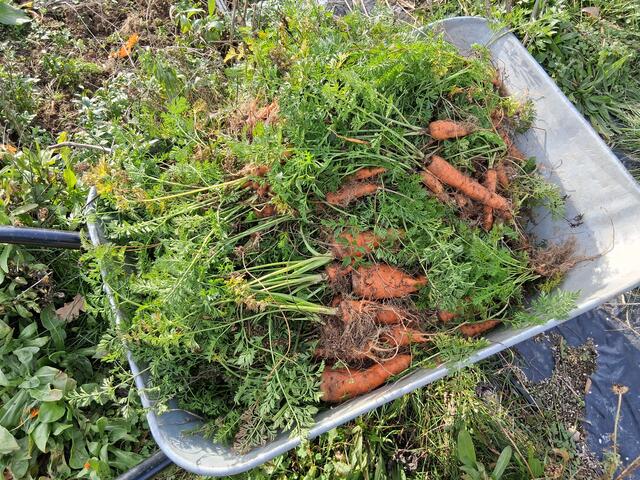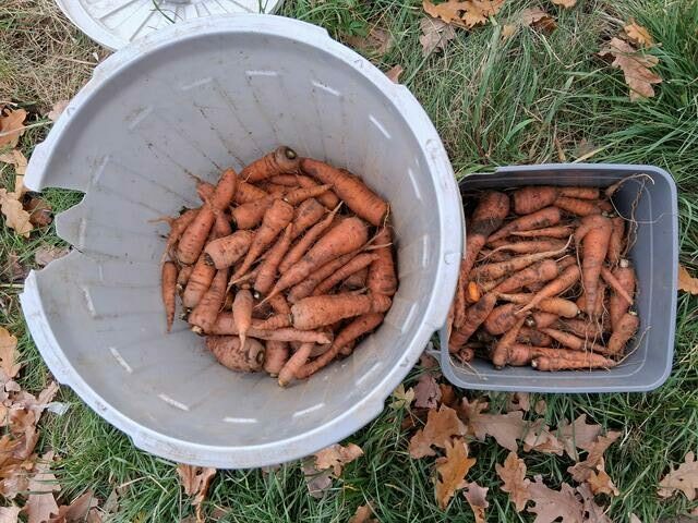 Druhé dva záhony pro česnek byli malinko složitější. Letos jsme tam pěstovali mrkev a z jednoho záhonu potřebovala ještě sklidit. Na tom druhém většinu mrkve sežrali hlodavci. Práci nám to ale neulehčilo, právě naopak. Když tam nebyla mrkev, tak to místo obsadili plevele. Přemýšlel jsem, že bychom zvolili nějaký jiný, náhradní záhon, protože čistit se mi ho nechtělo. Manželka se ho ale rozhodla vyčistit, tak jsem ji nechal a šel sklízet mrkev na druhý záhon. Tam to aspoň vypadalo, že tam mrkev roste. Úroda nebyly úplně podle mých představ. Dost mrkví bylo spíše menších, ale našlo se i pár hezkých kousků. Zkoušeli jsme pár odrůd, a ne u všech to dopadlo dobře. Nejlépe dopadla odrůda „Katrin“ a pokud by byla na celém záhoně, tak by to asi bylo o poznání lepší. Příští rok zkusíme jenom tuhle odrůdu. Semínka už mám koupená.