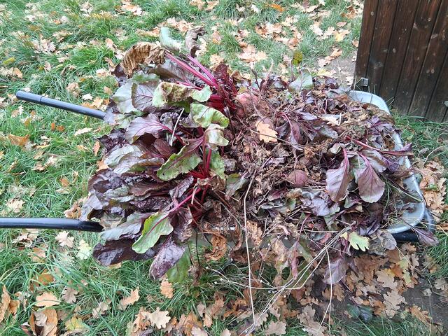 Po dobu, co jsem já kosil, se manželka rozhodla sklidit řepu. Ta tento rok úplně dobře nedopadla. Asi to bylo ne úplně dobrou půdou v záhoně a možná i něčím jiným. Vysévali jsme mix různých semínek, a i výsledek byl různý. Více se o tom rozepíšu v článku o zelenině. Jenom jsem si udělal mentální poznámku, že si musíme lépe pohlídat semenaření, aby se nekřížila řepa s mangoldem. Tento rok to bylo vidět u části úrody. Jako na zlost právě u té řepy, co v průběhu sezony nejlépe rostla. I když ono to byl spíše mangold než řepa. Manželka to využila tak, že sklidila ty hezké mohutné listy, které doma blanšírovala, zamrazila a použijí se pak jako mangold.