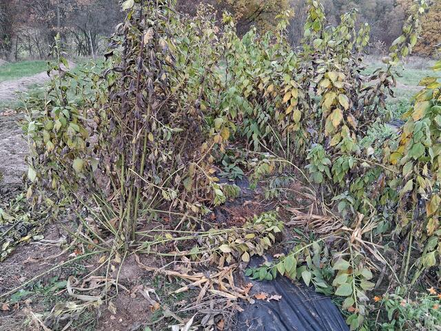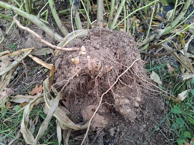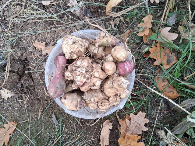 Při procházení záhonů jsem si všiml, že u topinamburů se začínají některé rostliny vyvracet. To se stává těsně před zimou, nebo v zimě, kde už „aktivně“ nerostou. Minulý rok jsem je zapomněl posekat, co se nám trochu vymstilo. Tento rok jsem to nechtěl zanedbat, protože úroda vypadá slibně a škoda o ní přijít. Když se rostlina vyvrátí, tak část hlíz vyjde na povrch. Zatím co pod zemí jsou topinambury přes zimu v pohodě, na povrchu to tak není.
