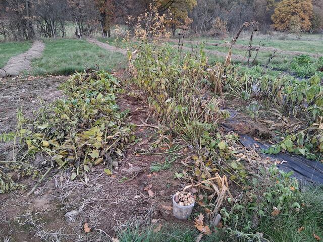 Jedna rostlina byla vyvrácená až moc, tak jsem raději hlízy sklidil. Nebylo toho nějak závratně moc, ale menší kbelík jsem naplnil. Určitě je to o hodně lepší než minulý rok. Na začátku sezony jsem se obával, jak to dopadne, protože půda v záhonech není úplně podle mých představ. Ale vypadá to, že nějaký ten kompost, který na záhonech zůstal, celkem pomohl.