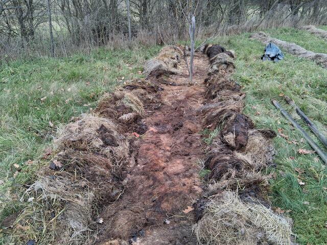 Našetřené jsme měli semínka mirabelek, broskvoní, meruněk, třešní, višní (strom i keř) a různých druhů slivoní. Ještě před samotným výsevem jsme ale chtěli sundat silážní plachtu, kterou jsme měli nataženou pod částí jedné syntropic řady. Dali jsme ji tam pod seno, aby to lépe vyhnilo, ale nevím, jestli to mělo nějak zvlášť lepší účinek v porovnání s čistým senem.