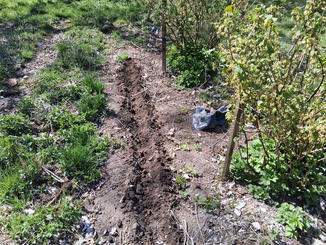 Po mrkvi jsme se už podle plánu pustili do výsevu hrášku. Ten jsme už v Praze namočili do vody, abychom podpořili klíčení. Výběr záhonů jsem udělal po paměti a později jsem zjistil, že jsme tam měli naplánován výsev fazole. Až tak moc to nevadí, protože jedno i druhé je luskovitá zelenina. Tu jsme tam chtěli vysít hlavně z důvodu, že minulý rok tam byla řepa a moc se ji nedařilo. Takže jsme si mysleli, že je tam horší půda a výsev luskoviny by mohl pomoct. Při přípravě záhonu mi ale přišlo, že ta půda je tam celkem hezká. I když jsem záhon kypřil vidlemi, tak to nevypadalo, že by to bylo vůbec potřeba. I čistit nebylo moc co (i když na první pohled vypadá záhon hrozně), hlavně jako obvykle okraje záhonů, kolem kterých roste tráva.