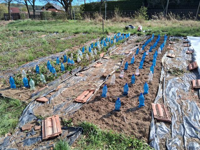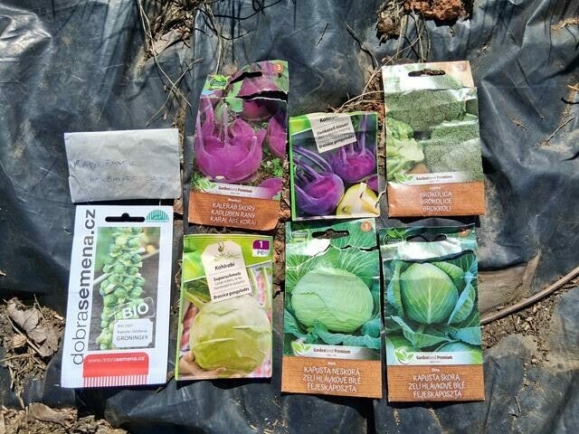 Po výsevu hrášku a obědě jsme se pustili do přípravy záhonů pro brukvovitou zeleninu. Zvolili jsme jeden záhon po rajčatech a jeden záhon po bramborách. Na záhonu po rajčatech bylo ještě dost mulče, tak jsem ho zase odvozil na syntropic řadu. Po odstranění mulče už nebylo ani skoro co k dočištění. Na povrchu půdy zůstalo ještě celkem dost rozloženého kompostu, co by mohlo při pěstování brukvovité zeleniny pomoct. Rozhodli jsme se zde vysít zelí. Semínka jsme měli ještě z minulého roku. Odrůdy „Dita“ a „Holt“. Na záhoně jsme udělali tři řady jamek. Do střední řady jsme vyseli skoré zelí a po stranách jsme chtěli vysít pozdní zelí. Při výsevu jsem zjistil, že semínek pozdního zelí moc nemáme, tak jsem je raději vysel do jedné řady a do druhé postranní řady jsem vysel brokolici odrůdy „Limba“. Taky zbytky semínek z minulého roku. Vysévali jsme do zalitých jamek (namokro). Po výsevu jsme semínka jemně zahrnuli a výsevná místa zakryli kryty z PET láhví.