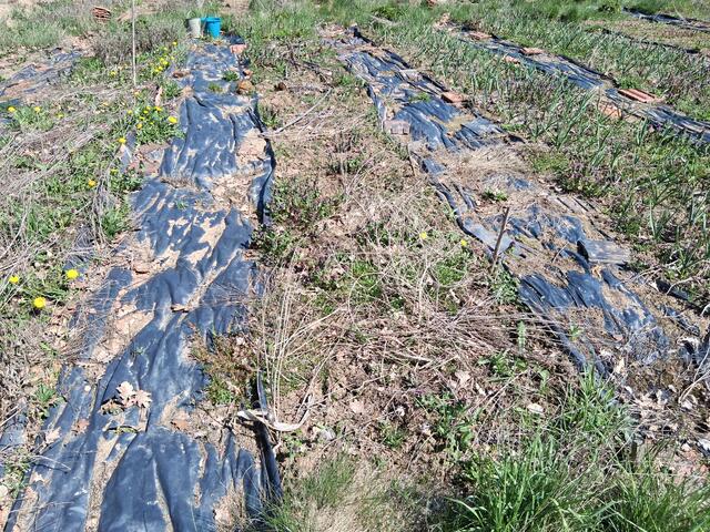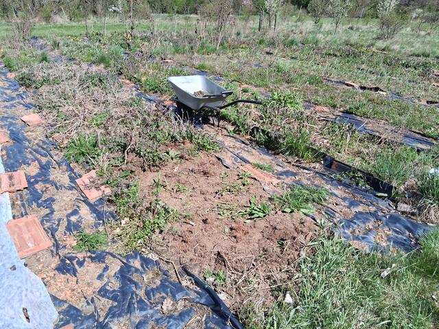 Druhý záhon po bramborách byl trochu komplikovanější. Mulč jsem z něho odstranil již na podzim a vyseli jsme tam zelené hnojení. Většina zeleného hnojení byla po zimě už pryč, ale pár rostlin ozimé řepky tam ještě zůstalo. Kromě toho tam bylo celkem dost rostlin hluchavky nachové, nějaká půdopokryvná rostlina a trochu různých trav. Odstranili jsme jenom ty trávy a zbytek záhonu nechali tak. Byli jsme už unaveni a nechtělo se nám čistit celý záhon. Taky jsem chtěl zkusit výsevy do toho porostu co tam je a nechtěl jsem moc obnažovat půdu. Než ty brukve vyklíčí a povyrostou, tak by už hluchavka měla i tak pomalu mizet a ten zbytek porostu je spíše menšího vzrůstu. Když tak to budu korigovat (sestřihávat) v průběhu roku.
