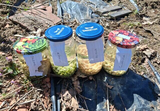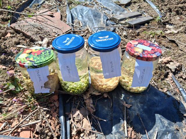 Vysévali jsme odrůdy hrášku „Avola“, „Gloriosa“, „Oskar“ a „Winner“. Dvě odrůdy jsme měli z vlastních semínek, další dvě jsem koupil už minulý rok v létě, kde jsme zkoušeli podzimní výsevy. Dopadlo to špatně, protože hrášek skoro vůbec nevyklíčil, a i těch pár rostlin co vyklíčilo, tak moc nerostlo. Snad to letos dopadne lépe. Hlavním cílem je namnožit si dostatek osiva pro další pěstování. Minulý rok jsme díky hlodavcům nesklidili skoro žádná semínka na výsev.