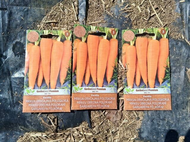 Pak jsme už pospíchali na zahradu, protože práce před námi bylo hodně. Hned po příjezdu jsme doseli zbytek záhonu s mrkví, co nám zbylo z minulého týdne. Koupili jsme semínka odrůdy „Kardila“. Nikdy jsem o ní neslyšel, ale podle popisu na sáčku se mi zdála vhodná. Už minule udělané řádky na záhonu jsme zase zalili, vyseli semínka a celý záhon zakryli netkanou textilii.