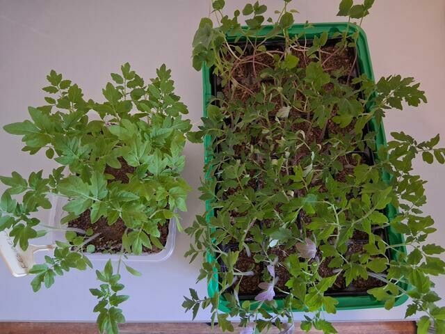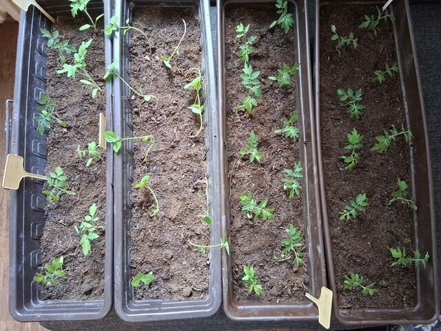 U rajčat bylo potřeba trochu zvažovat, kolik si toho necháme. Nakonec jsem se rozhodl dát do jednoho truhlíku po dvě rostliny od odrůd „Resibella“, „Sunviva“, „Divoké zlaté“ a „Humboldtovo“. První dvě odrůdy chceme vysadit na chalupě a na více rostlin tam zatím není místo. Divoká rajčata jsem měl v plánu vysadit do jednoho záhonu, ale asi je nakonec rozdělím podle odrůd a promíchám s odrůdou „Valouny“, která bude tvořit většina našich letos pěstovaných rajčat. U této odrůdy jsem váhal, kolik rostlin si necháme. Vzhledem k tomu, že jsme měli kompost ještě pro dva truhlíky a místa na parapetu ještě méně, vybral jsem 20 rostlin a vysadil je po 10 do každého truhlíku.