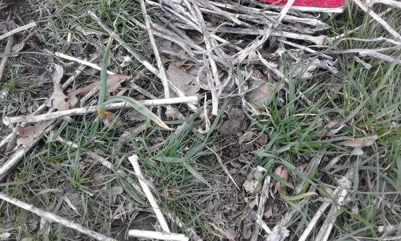 O česneku nezmaru jsem už psal v některém z předešlých článků. Zatím ho ještě necháváme na těch záhonech, kde ještě nic nedáváme, ale další týden už ho asi sklidíme a budeme mít další várku jarního česneku pro skvělý jarní krém. Špenátu po zimě je taky ještě dost. Manželka mně ale upozornila na další ukázku životaschopnosti česneku. U provizorního stolku, kde minulý rok čistila česnek, hodila jenom tak na zem pár stroužků, které byli nějak poškozené, nebo napadené. Ty stroužky tam zůstali a ne jenom že přečkali celé to období, ale byli schopné i zakořenit a začít růst. Všimněte si, že česnek ani není v půdě. Leží jenom na povrchu a kořínky které vyhnal se chytli v půdě. To mu ale nebrání v tom, aby začal růst. Asi ho pokusně necháme, co bude schopen ještě vytvořit.